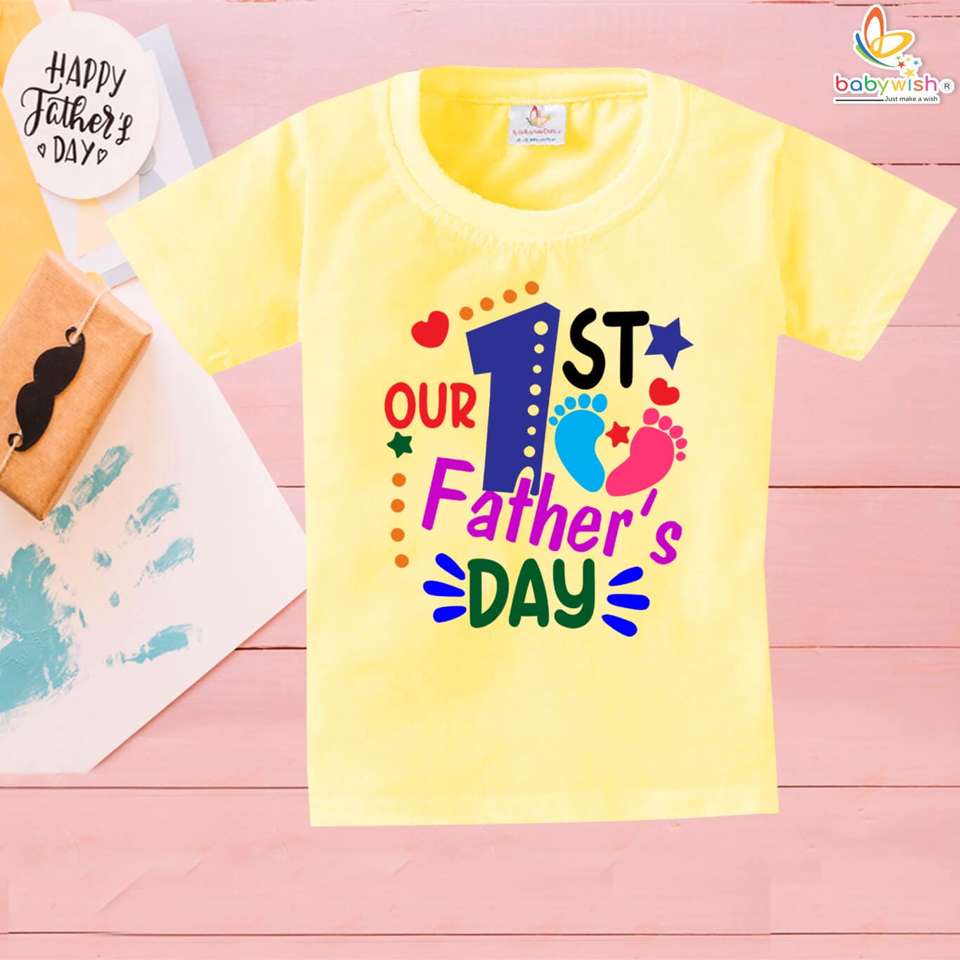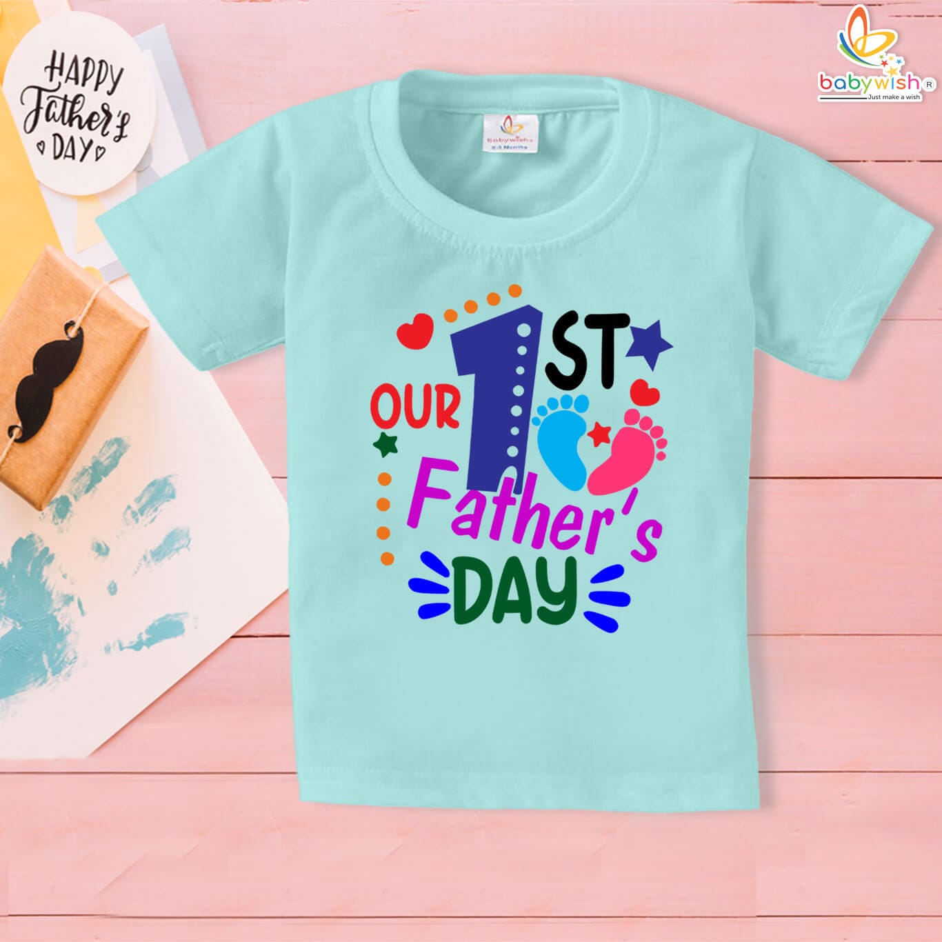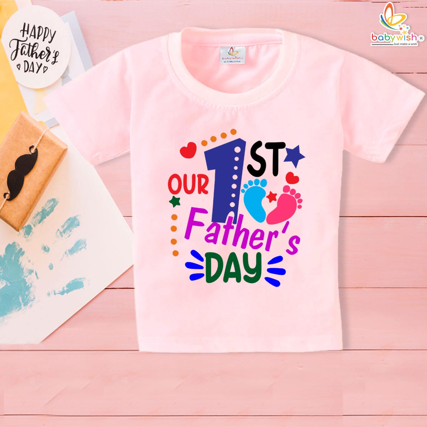 Mark the unforgettable moment of a first Fathers Day with our sweet Our first Fathers Day heart print Tshirt. This comfy unisex tee is perfect for little ones to gift their superhero dad. Designed for love filled family photos and special bonding memories. A beautiful, meaningful keepsake to celebrate the start of fatherhood only at Babywish.