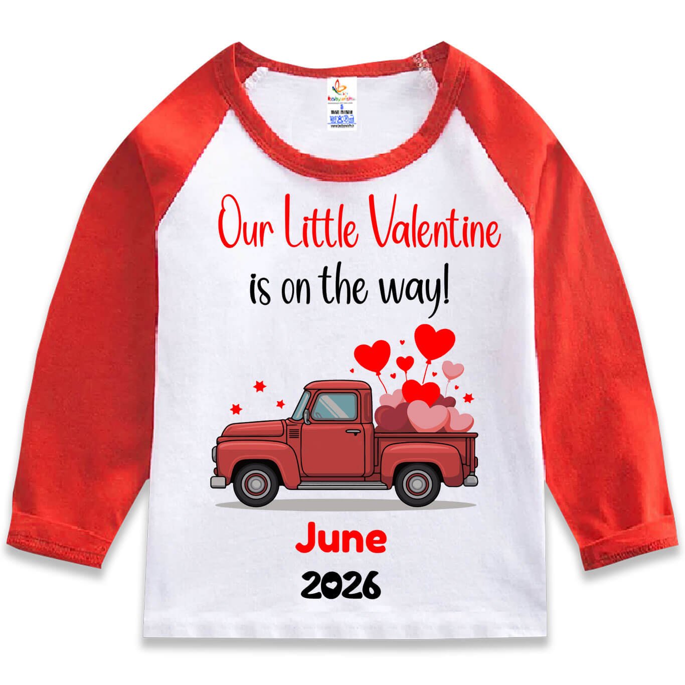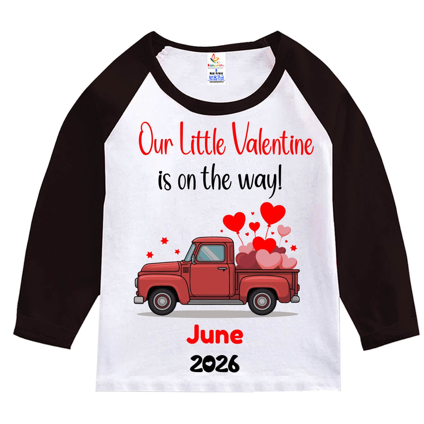 Designed with a cute red vintage truck carrying heart balloons and the romantic message “Our Little Valentine is on the way!”, this T-shirt also features customizable month and year (like June 2026), making it a special keepsake for parents-to-be. The baseball-style raglan design in Red-White or Black-White adds a stylish and trendy look for both babies and toddlers.