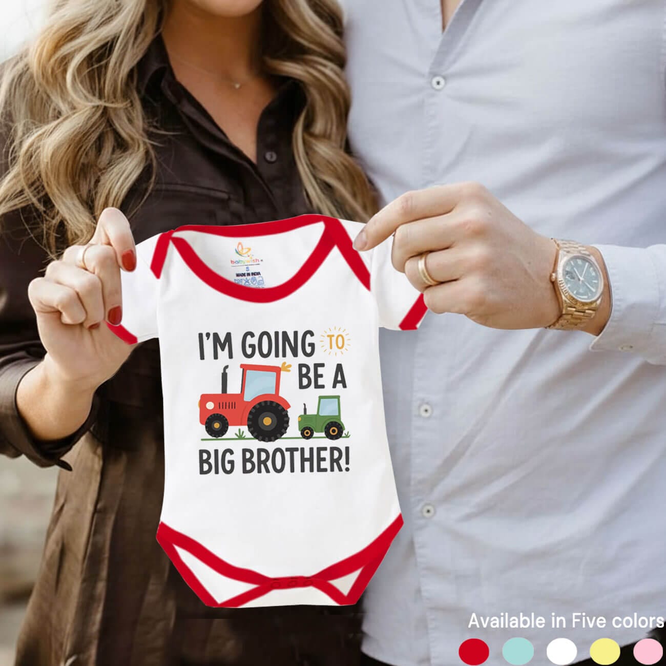 Celebrate the exciting news of a new baby on the way with our “I’m Going to Be a Big Brother” Baby Romper, designed to make sibling announcements extra adorable. This cute tractor-themed bodysuit is perfect for pregnancy reveal photoshoots, family announcements, or gifting to expecting parents.