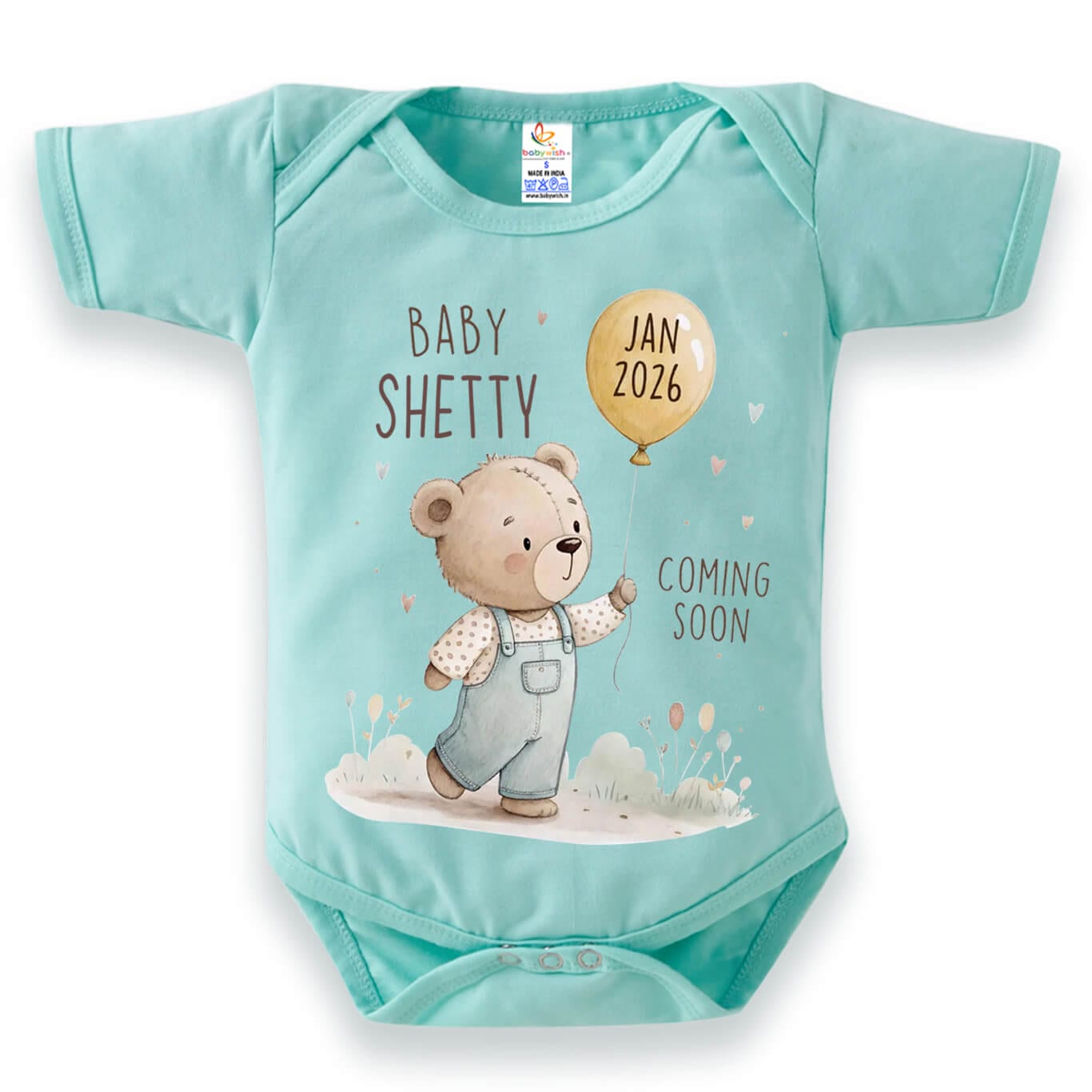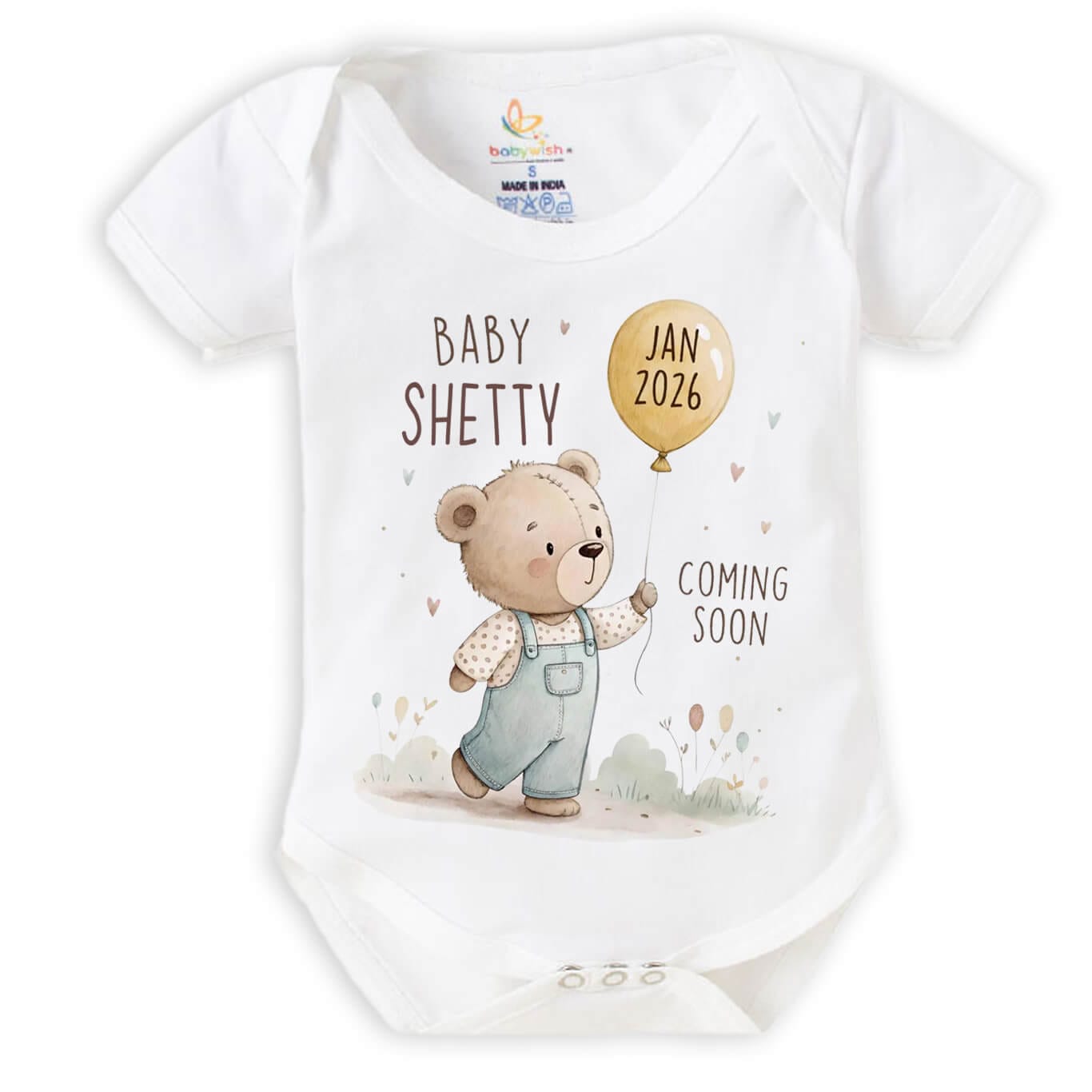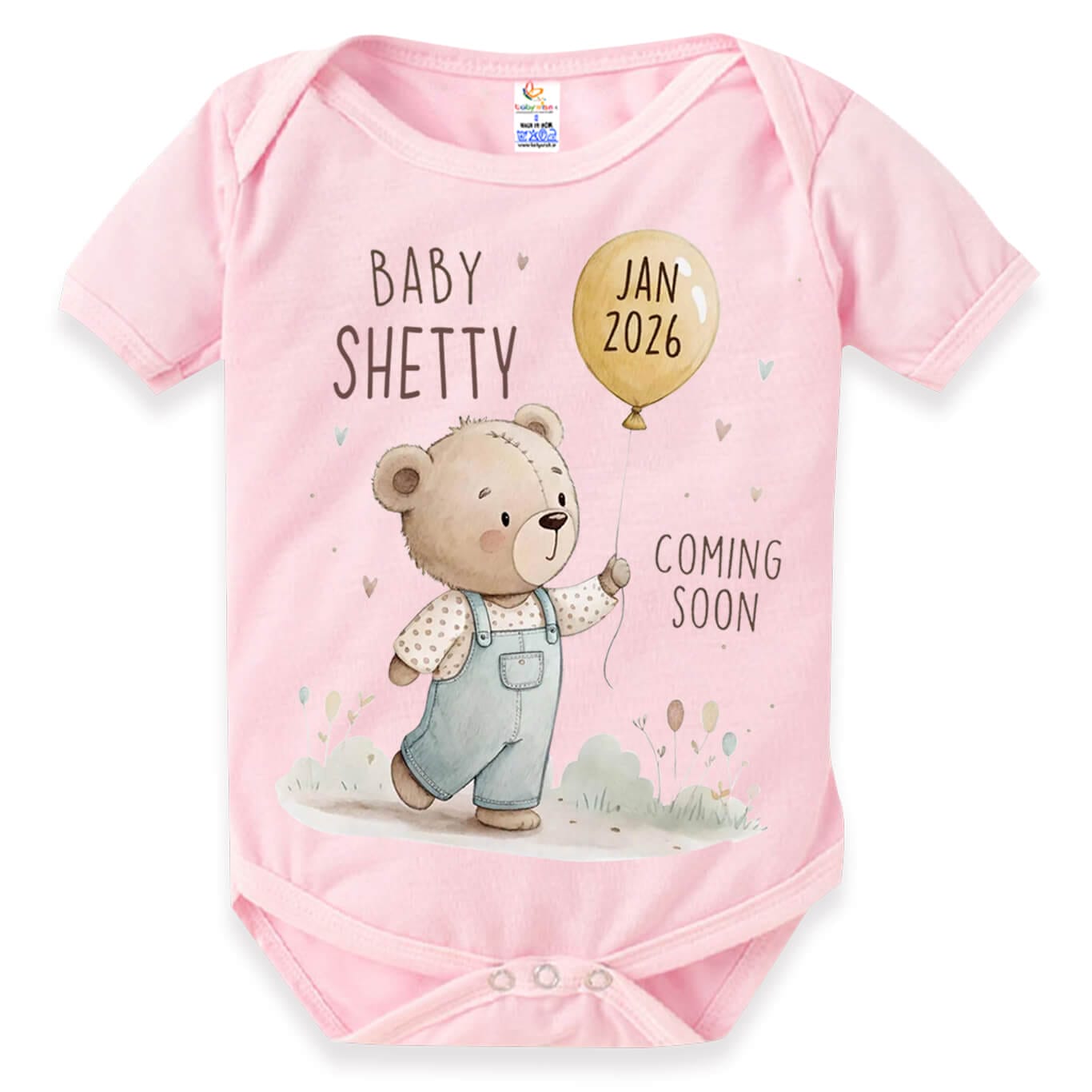 Celebrate your upcoming bundle of joy with the “Baby Shetty Coming Soon” baby romper from Babywish — a perfect way to share your exciting news with family and friends! This charming white onesie features a hand-drawn teddy bear holding a balloon printed with “Jan 2026”, symbolizing love, hope, and new beginnings.