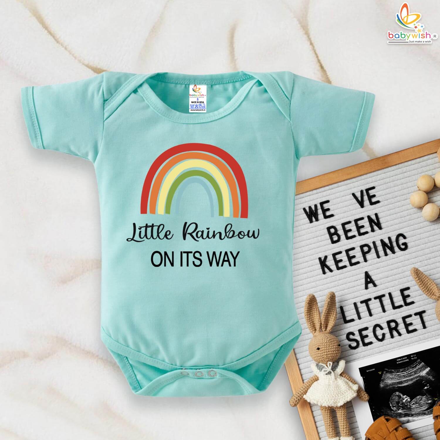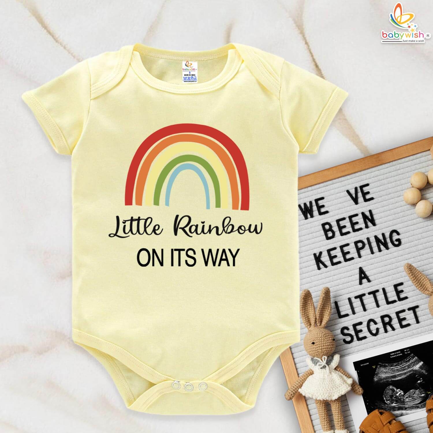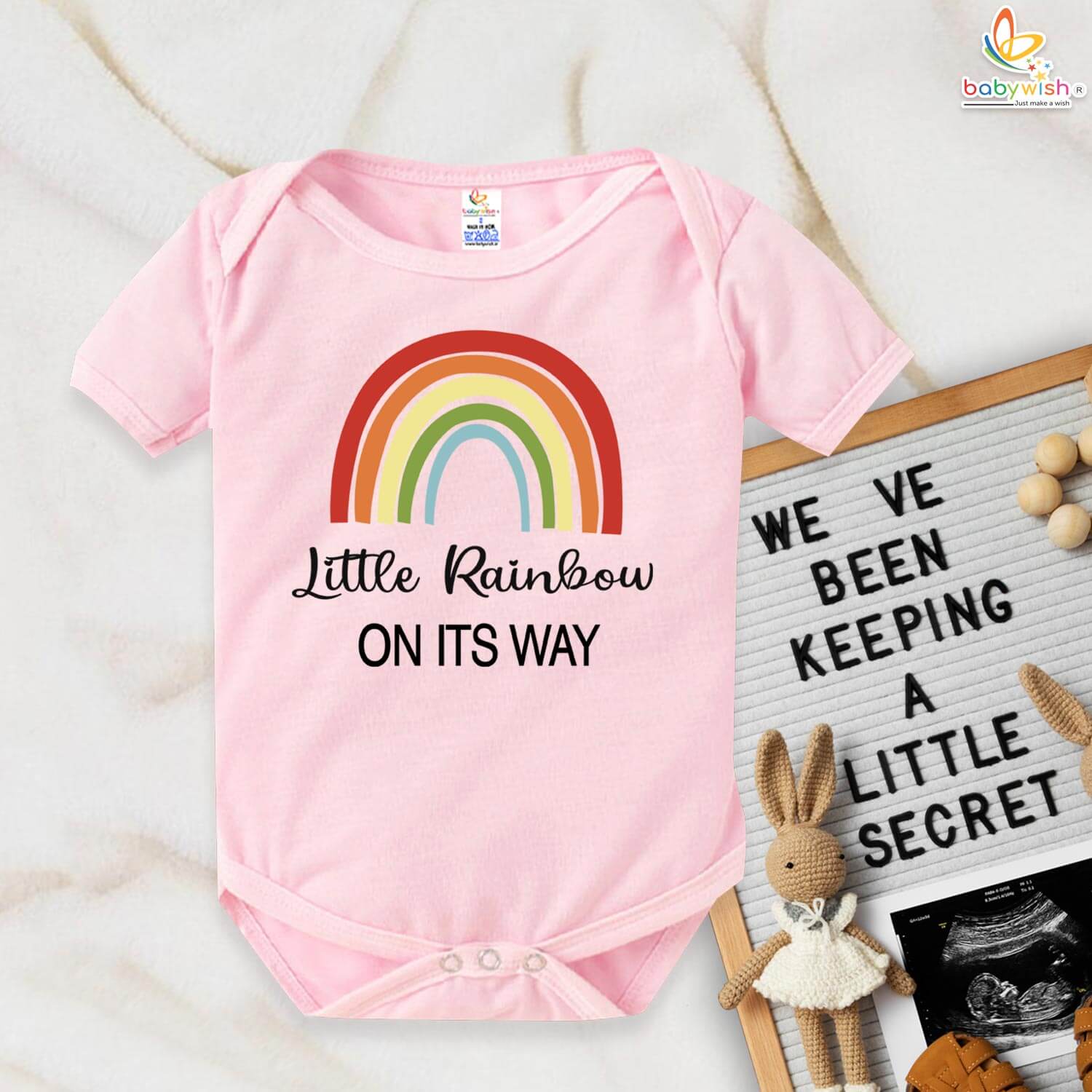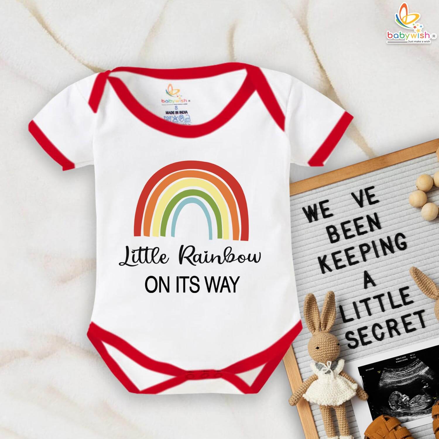 Announce your beautiful rainbow baby with the “Little Rainbow On Its Way” baby bodysuit from Babywish — a heartwarming way to celebrate love, hope, and new beginnings. Featuring a cheerful rainbow print and sweet message, this romper makes a perfect outfit for pregnancy reveals, baby showers, or newborn photo sessions.