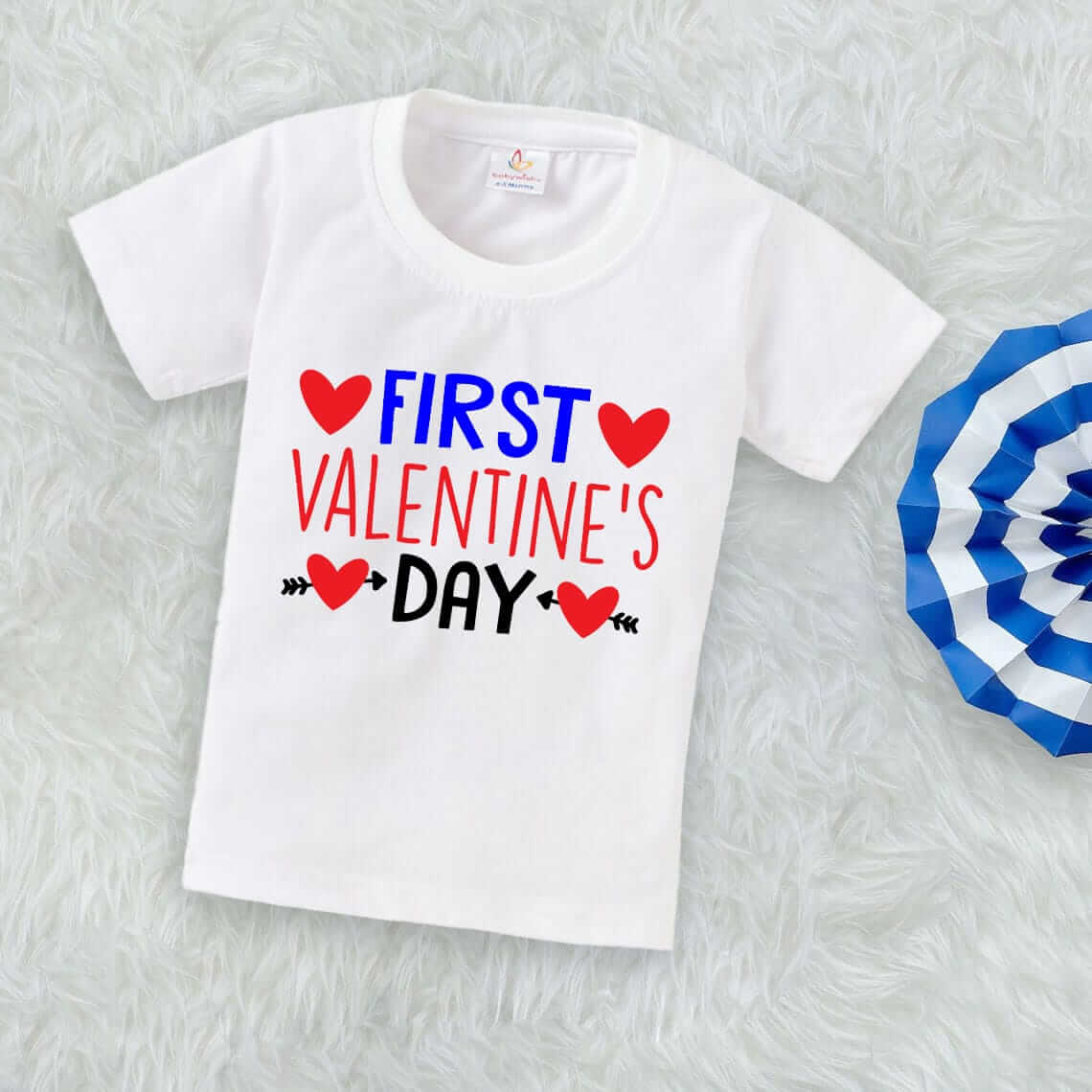 Valentine’s Day T-shirt for Kids | Unisex Valentine Topwear Outfit | Printed Half Sleeve T-shirt Dress for Boys & Girls “First Valentine Heart” | Cute Gift for Kids