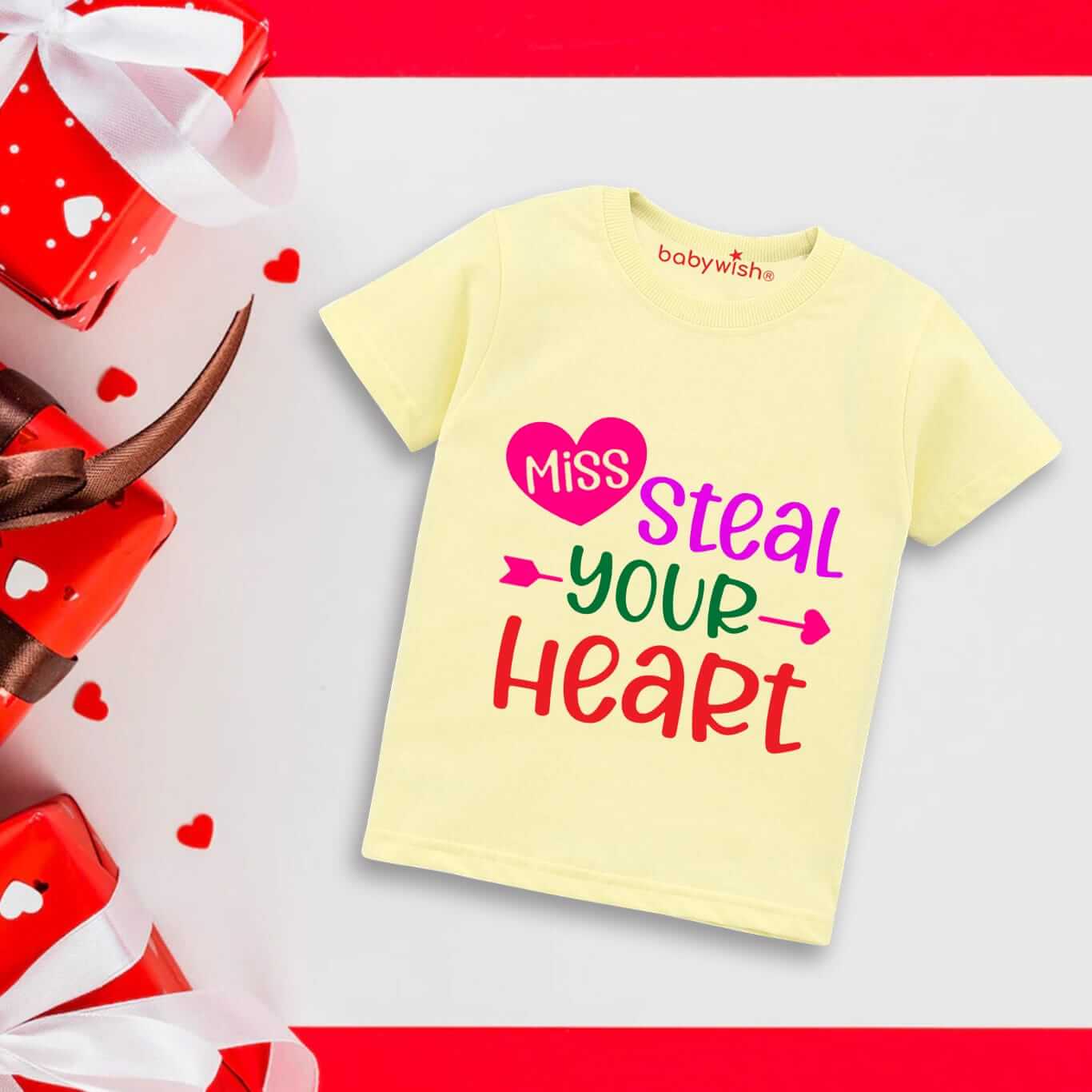 Valentine’s Day T-shirt for Kids | Unisex Valentine Topwear Outfit | Printed Half Sleeve T-shirt Dress for Boys & Girls “Miss Heart Stoled”