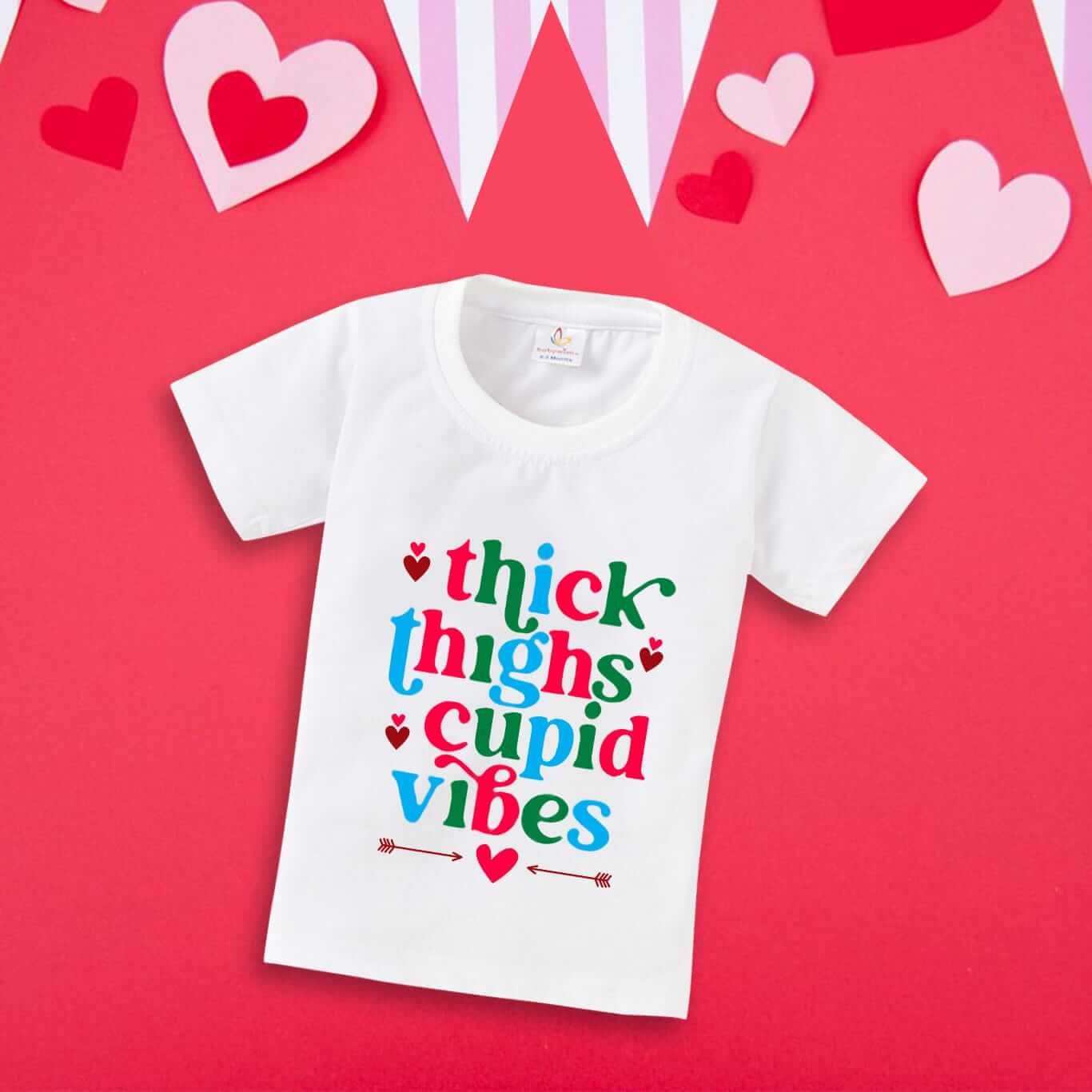 Valentine’s Day T-shirt for Kids | Unisex Valentine Topwear Outfit | Printed Half Sleeve T-shirt Dress for Boys & Girls “Thick Thigh Cupid Vibes” | Cute Gift for Kids